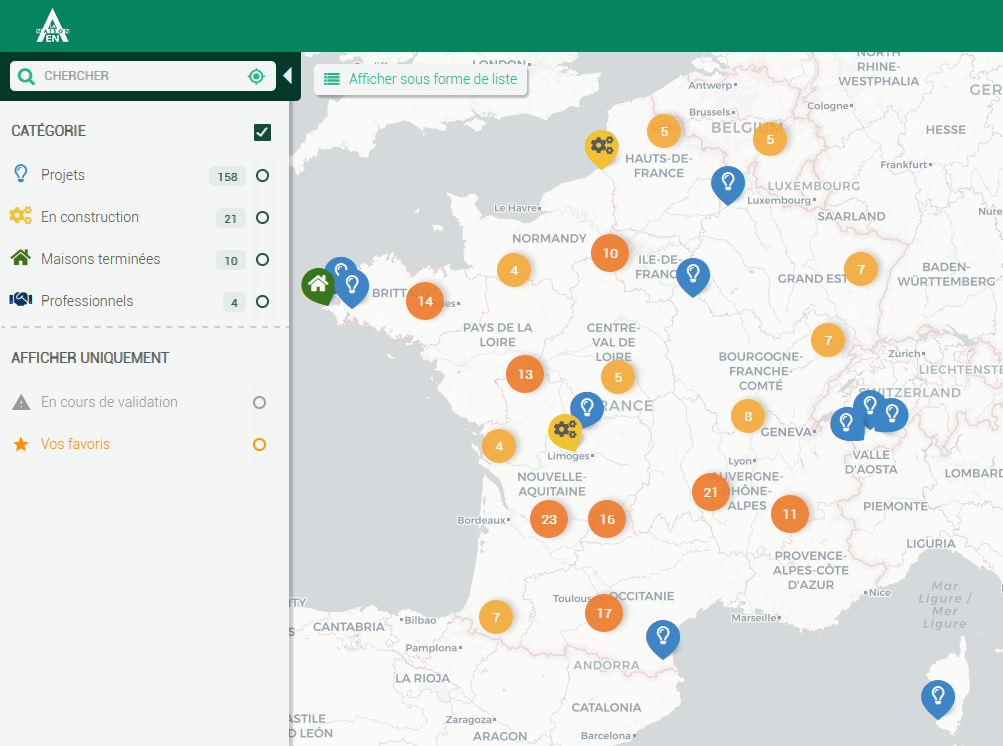 C'est une carte interactive alimentée collectivement par la communauté, où on peut voir les maisons en projet, en construction, terminées, et les professionnels.